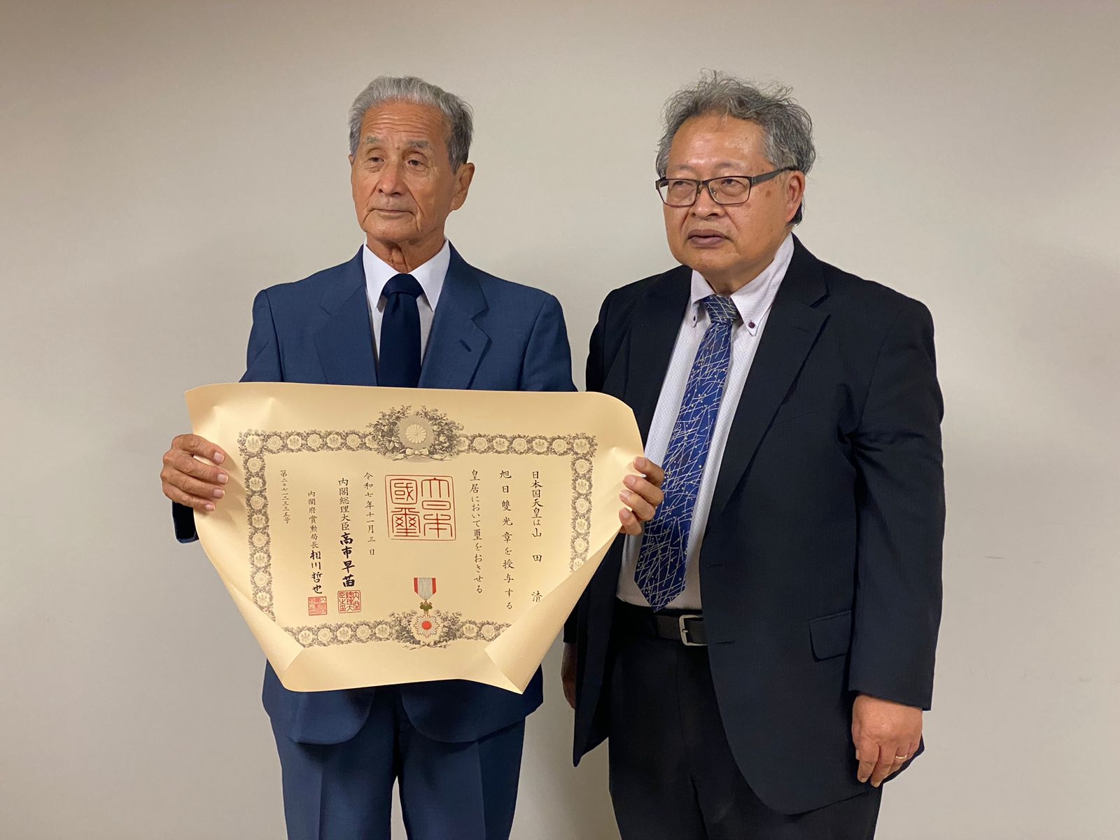 この度、山田氏のこれらの功績に対して旭日双光章が伝達されました。